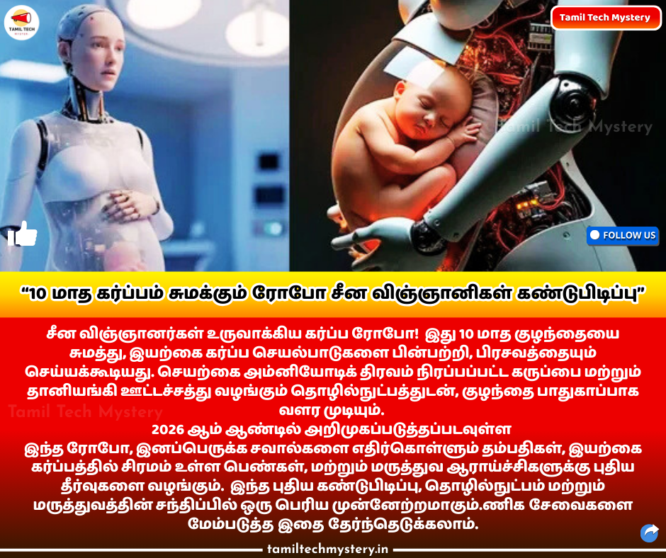 சீன விஞ்ஞானிகள் ஒரு கர்ப்ப ரோபோ (Pregnancy Robot) உருவாக்கியுள்ளனர், இது 10 மாதங்கள் குழந்தையை சுமந்து, பிறப்பிக்கவும் இயல்பான மனித கர்ப்ப செயல்பாடுகளைப் பின்பற்றக்கூடியதாக உள்ளது. இந்த கண்டுபிடிப்பு தொழில்நுட்ப உலகில் ஒரு பெரிய முன்னேற்றமாகும் மற்றும் இனப்பெருக்க மருத்துவத்தில் புதிய மாற்றங்களை ஏற்படுத்தும் என எதிர்பார்க்கப்படுகிறது.