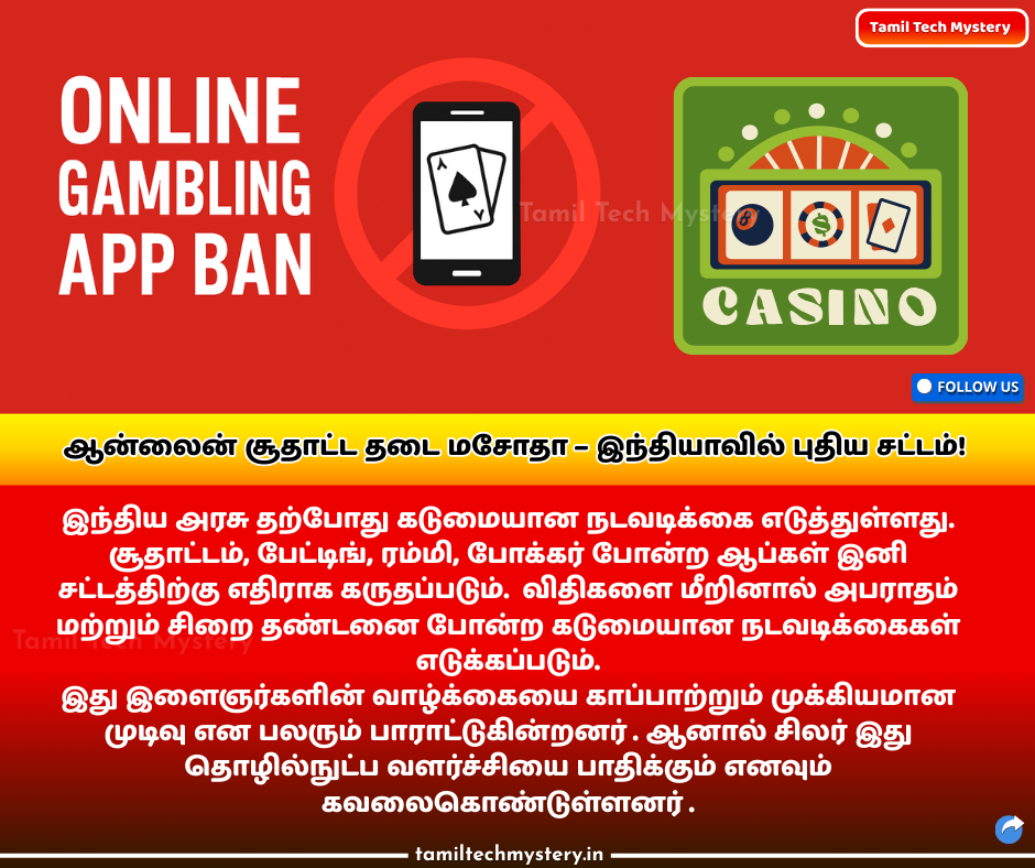 - பணம் வைத்து விளையாடப்படும் அனைத்து ஆன்லைன் சூதாட்ட விளையாட்டுகளும் தடை செய்யப்பட்டுள்ளன.