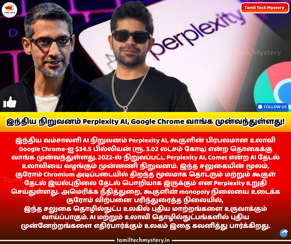 | Perplexity AI யார்? | 2022-ல் நிறுவப்பட்ட இந்திய வம்சாவளி AI நிறுவனம், Comet என்ற AI தேடல் உலாவி வழங்குகிறது. |