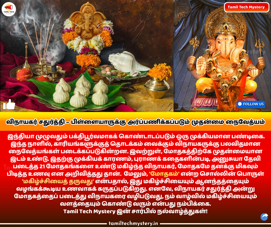 இந்த ஆண்டு விநாயகர் சதுர்த்தியில், நீங்கள் பிள்ளையாரை வழிபடும் போது, அன்போடு மோதகம் படைத்து சமர்ப்பியுங்கள். அது உங்கள் இல்லத்தில் ஆனந்தத்தையும் அமைதியையும் தரும்.